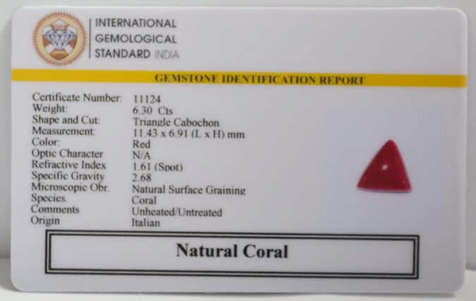 Beautiful 6.3 Cts Natural Coral (AAA+-Mines) sva 7+ Ratti CORAL. Free Horoscope & Free Pundit Ji Astrological Advise / Consultation. Original Natural Lab certified gems by IGI GTL / Birth stones / Large Gem Selection of shree shubh Rashi Ratan Vedic dhan at Gem Mines. May Bhagwan Brahma, Vishnu, Shiv & Universe bless you.
