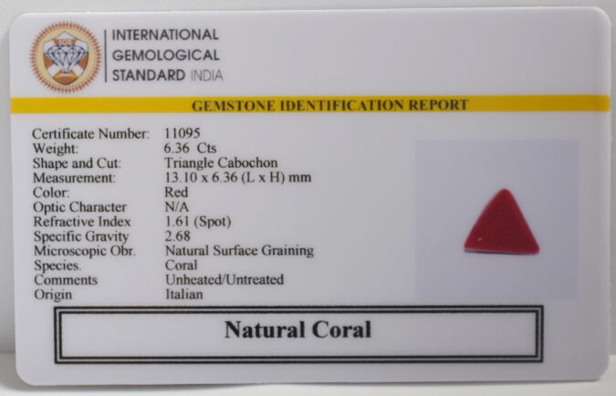 Beautiful 6.36 Cts Natural Coral (AAA+-Mines) sva 7+ Ratti CORAL. Free Horoscope & Free Pundit Ji Astrological Advise / Consultation. Original Natural Lab certified gems by IGI GTL / Birth stones / Large Gem Selection of shree shubh Rashi Ratan Vedic dhan at Gem Mines. May Bhagwan Brahma, Vishnu, Shiv & Universe bless you.