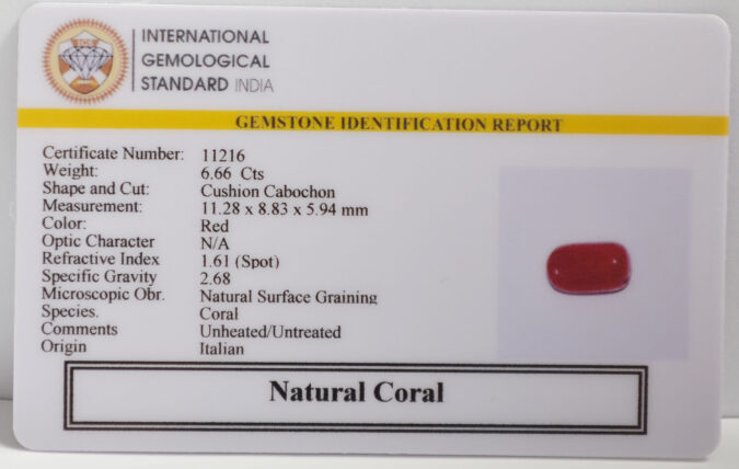 Beautiful 6.66 Cts Natural Coral (AAA+-Mines) sva 7+ Ratti CORAL. Free Horoscope & Free Pundit Ji Astrological Advise / Consultation. Original Natural Lab certified gems by IGI GTL / Birth stones / Large Gem Selection of shree shubh Rashi Ratan Vedic dhan at Gem Mines. May Bhagwan Brahma, Vishnu, Shiv & Universe bless you.
