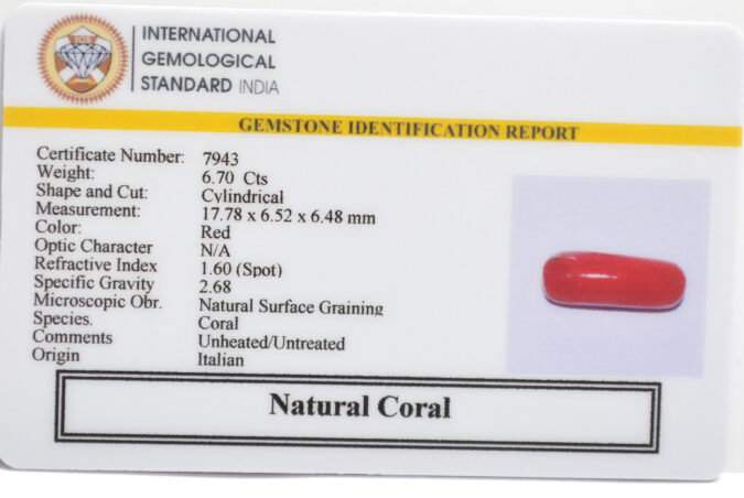 Certified Natural Coral 6.7 Ct.(7+ Ratti) in Cylindrical shape