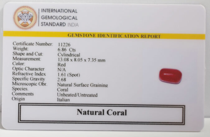 Beautiful 6.86 Cts Natural Coral (AAA+-Mines) sva 7+ Ratti CORAL. Free Horoscope & Free Pundit Ji Astrological Advise / Consultation. Original Natural Lab certified gems by IGI GTL / Birth stones / Large Gem Selection of shree shubh Rashi Ratan Vedic dhan at Gem Mines. May Bhagwan Brahma, Vishnu, Shiv & Universe bless you.