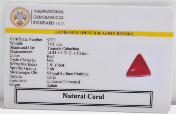 Beautiful 7.01 Cts Natural Coral (Top-Mines) sva 7+ Ratti CORAL. Free Horoscope & Free Pundit Ji Astrological Advise / Consultation. Original Natural Lab certified gems by IGI GTL / Birth stones / Large Gem Selection of shree shubh Rashi Ratan Vedic dhan at Gem Mines. May Bhagwan Brahma, Vishnu, Shiv & Universe bless you.