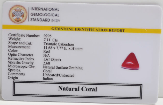 Beautiful 7.11 Cts Natural Coral (Top-Mines) sva 7+ Ratti CORAL. Free Horoscope & Free Pundit Ji Astrological Advise / Consultation. Original Natural Lab certified gems by IGI GTL / Birth stones / Large Gem Selection of shree shubh Rashi Ratan Vedic dhan at Gem Mines. May Bhagwan Brahma, Vishnu, Shiv & Universe bless you.