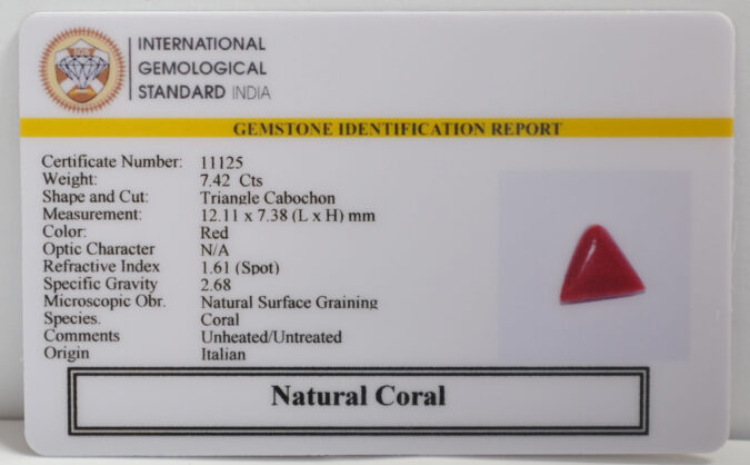 Beautiful 7.42 Cts Natural Coral (AAA-Mines) sva 8+ Ratti CORAL. Free Horoscope & Free Pundit Ji Astrological Advise / Consultation. Original Natural Lab certified gems by IGI GTL / Birth stones / Large Gem Selection of shree shubh Rashi Ratan Vedic dhan at Gem Mines. May Bhagwan Brahma, Vishnu, Shiv & Universe bless you.
