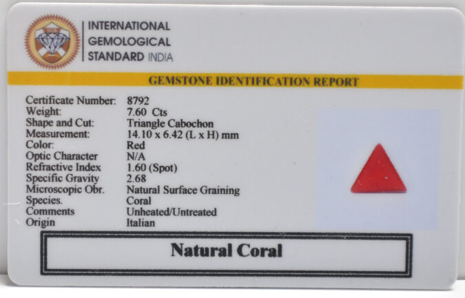 Beautiful 7.6 Cts Natural Coral (AAA-Mines) sva 8+ Ratti CORAL. Free Horoscope & Free Pundit Ji Astrological Advise / Consultation. Original Natural Lab certified gems by IGI GTL / Birth stones / Large Gem Selection of shree shubh Rashi Ratan Vedic dhan at Gem Mines. May Bhagwan Brahma, Vishnu, Shiv & Universe bless you.
