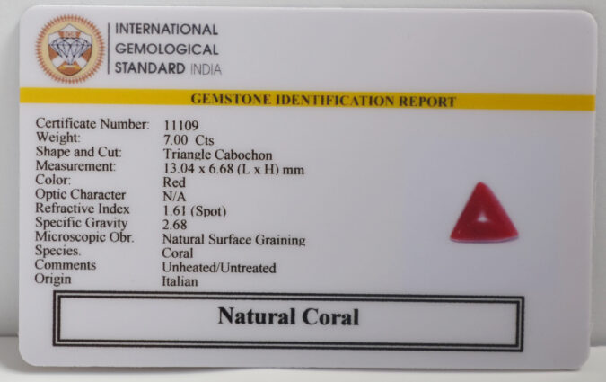 Beautiful 7 Cts Natural Coral (AAA+-Mines) sva 7+ Ratti CORAL. Free Horoscope & Free Pundit Ji Astrological Advise / Consultation. Original Natural Lab certified gems by IGI GTL / Birth stones / Large Gem Selection of shree shubh Rashi Ratan Vedic dhan at Gem Mines. May Bhagwan Brahma, Vishnu, Shiv & Universe bless you.
