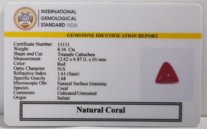Beautiful 8.16 Cts Natural Coral (AAA+-Mines) sva 9+ Ratti CORAL. Free Horoscope & Free Pundit Ji Astrological Advise / Consultation. Original Natural Lab certified gems by IGI GTL / Birth stones / Large Gem Selection of shree shubh Rashi Ratan Vedic dhan at Gem Mines. May Bhagwan Brahma, Vishnu, Shiv & Universe bless you.