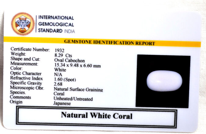 Beautiful 8.29 Cts Natural White Coral (Good-Mines) sva 9+ Ratti CORAL. Free Horoscope & Free Pundit Ji Astrological Advise / Consultation. Original Natural Lab certified gems by IGI GTL / Birth stones / Large Gem Selection of shree shubh Rashi Ratan Vedic dhan at Gem Mines. May Bhagwan Brahma, Vishnu, Shiv & Universe bless you.