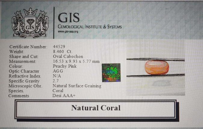 Beautiful 8.46 Ct. Coral (Desi Coral Mines) Sava 9 Ratti Moonga. Free Horoscope & Free Pundit Ji Advise / Consultation. Original Natural Lab certified gems by IGI GTL / Birth stones / Large Gem Selection of shree shubh Rashi Ratan Vedic dhan at Gem Mines. May Bhagwan Brahma, Vishnu, Shiv & Universe bless you.