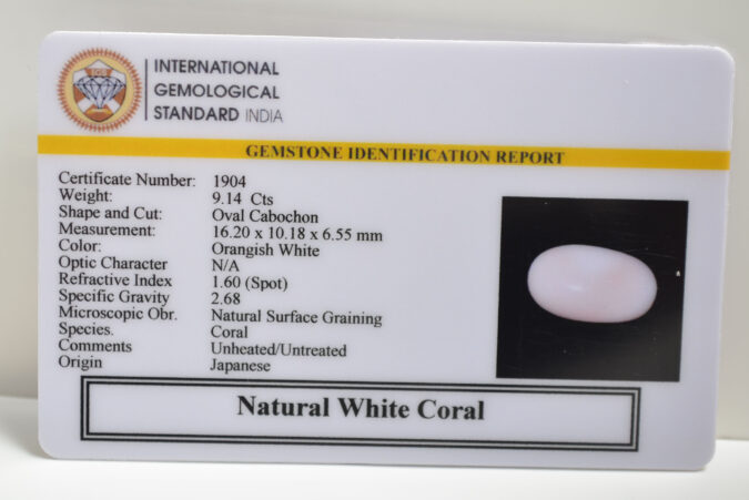 Beautiful 9.14 Cts Natural White Coral (Top+-Mines) sva 10+ Ratti CORAL. Free Horoscope & Free Pundit Ji Astrological Advise / Consultation. Original Natural Lab certified gems by IGI GTL / Birth stones / Large Gem Selection of shree shubh Rashi Ratan Vedic dhan at Gem Mines. May Bhagwan Brahma, Vishnu, Shiv & Universe bless you.