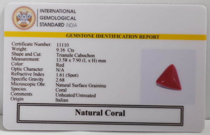 Beautiful 9.16 Cts Natural Coral (AAA+-Mines) sva 10+ Ratti CORAL. Free Horoscope & Free Pundit Ji Astrological Advise / Consultation. Original Natural Lab certified gems by IGI GTL / Birth stones / Large Gem Selection of shree shubh Rashi Ratan Vedic dhan at Gem Mines. May Bhagwan Brahma, Vishnu, Shiv & Universe bless you.