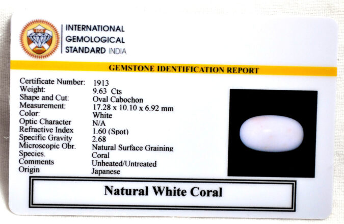 Beautiful 9.63 Cts Natural White Coral (Top-Mines) sva 10+ Ratti CORAL. Free Horoscope & Free Pundit Ji Astrological Advise / Consultation. Original Natural Lab certified gems by IGI GTL / Birth stones / Large Gem Selection of shree shubh Rashi Ratan Vedic dhan at Gem Mines. May Bhagwan Brahma, Vishnu, Shiv & Universe bless you.