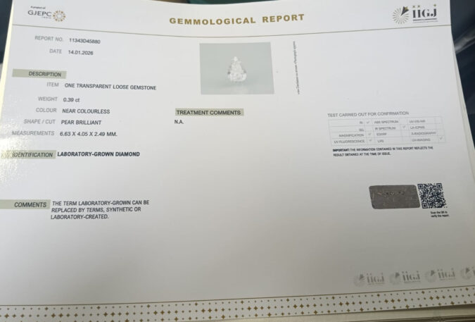 Certified CVD 0.39 Ct.(0+ Ratti) in Pear Brilliant shape / Color:Near Colourless / Clarity:CVD