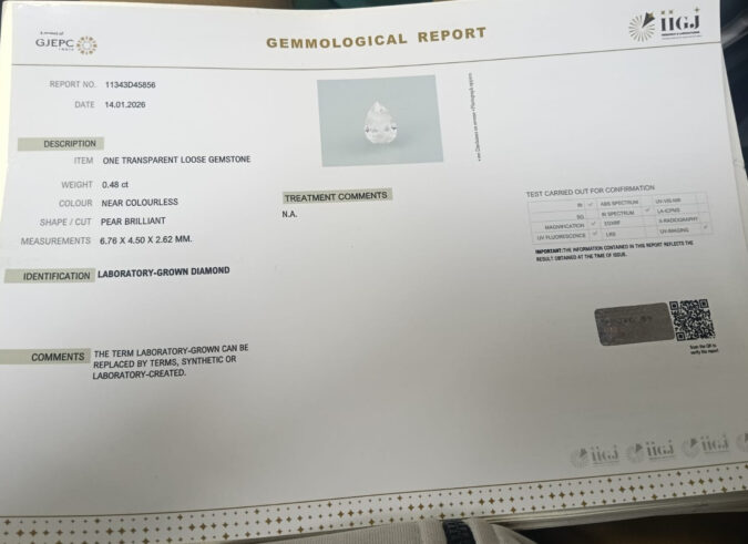 Certified CVD 0.48 Ct.(0+ Ratti) in Pear Brilliant shape / Color:Near Colourless / Clarity:CVD