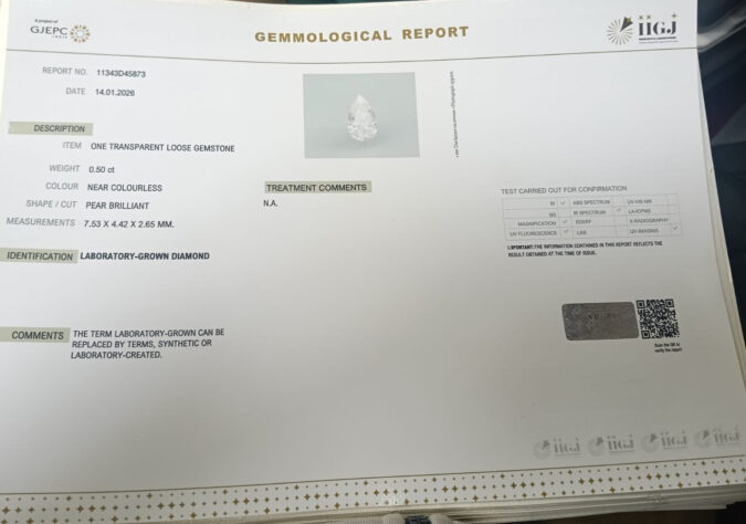 Certified CVD 0.5 Ct.(0+ Ratti) in Pear Brilliant shape / Color:Near Colourless / Clarity:CVD