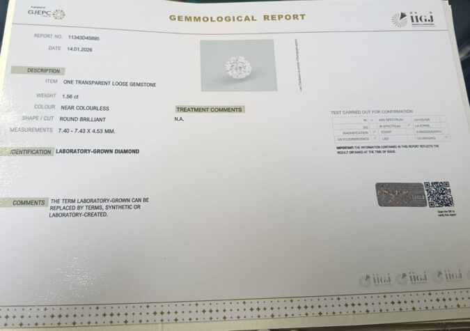 Certified CVD 1.56 Ct.(1+ Ratti) in Round Brilliant shape / Color:Near Colourless / Clarity:CVD
