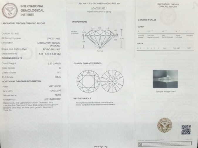 Certified CVD 2.53 Ct.(2+ Ratti) in Round Brilliant shape / Color:G / Clarity:SI-1