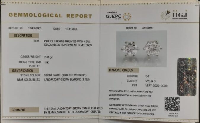 Beautiful 1.18 Cts CVD (Round Brilliant Cut) sva 1+ Ratti CVD Gold EARRING. / Color:E-F / Clarity:VVS & SI / Free Horoscope & Free Pundit Ji Astrological Advise / Consultation. Original Natural Lab certified gems by IGI GTL / Birth stones / Large Gem Selection of shree shubh Rashi Ratan Vedic dhan at Gem Mines. May Bhagwan Brahma, Vishnu, Shiv & Universe bless you.