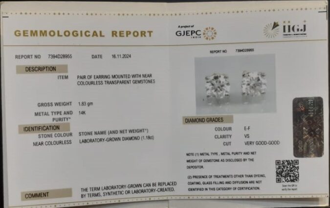 Beautiful 1.18 Cts CVD (Round Brilliant Cut) sva 1+ Ratti CVD Gold EARRING. / Color:E-F / Clarity:VS / Free Horoscope & Free Pundit Ji Astrological Advise / Consultation. Original Natural Lab certified gems by IGI GTL / Birth stones / Large Gem Selection of shree shubh Rashi Ratan Vedic dhan at Gem Mines. May Bhagwan Brahma, Vishnu, Shiv & Universe bless you.