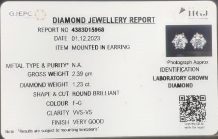 Beautiful 1.23 Cts CVD (Round Brilliant Cut) sva 1+ Ratti CVD Gold EARRING. / Color:F-G / Clarity:VVS-VS / Free Horoscope & Free Pundit Ji Astrological Advise / Consultation. Original Natural Lab certified gems by IGI GTL / Birth stones / Large Gem Selection of shree shubh Rashi Ratan Vedic dhan at Gem Mines. May Bhagwan Brahma, Vishnu, Shiv & Universe bless you.