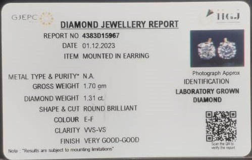 Beautiful 1.31 Cts CVD (Round Brilliant Cut) sva 1+ Ratti CVD Gold EARRING. / Color:E-F / Clarity:VVS-VS / Free Horoscope & Free Pundit Ji Astrological Advise / Consultation. Original Natural Lab certified gems by IGI GTL / Birth stones / Large Gem Selection of shree shubh Rashi Ratan Vedic dhan at Gem Mines. May Bhagwan Brahma, Vishnu, Shiv & Universe bless you.