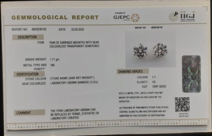 Beautiful 2.02 Cts CVD (Round Brilliant Cut) sva 2+ Ratti CVD Gold EARRING. / Color:E-F / Clarity:VS / Free Horoscope & Free Pundit Ji Astrological Advise / Consultation. Original Natural Lab certified gems by IGI GTL / Birth stones / Large Gem Selection of shree shubh Rashi Ratan Vedic dhan at Gem Mines. May Bhagwan Brahma, Vishnu, Shiv & Universe bless you.