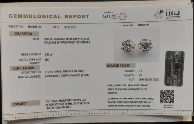 Beautiful 4.04 Cts CVD (Round Brilliant Cut) sva 4+ Ratti CVD Gold EARRING. / Color:G-I / Clarity:VS / Free Horoscope & Free Pundit Ji Astrological Advise / Consultation. Original Natural Lab certified gems by IGI GTL / Birth stones / Large Gem Selection of shree shubh Rashi Ratan Vedic dhan at Gem Mines. May Bhagwan Brahma, Vishnu, Shiv & Universe bless you.