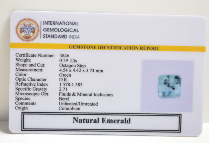 Beautiful 0.59 Cts Natural Emerald (AAA+-Mines) sva 0+ Ratti EMERALD. Free Horoscope & Free Pundit Ji Astrological Advise / Consultation. Original Natural Lab certified gems by IGI GTL / Birth stones / Large Gem Selection of shree shubh Rashi Ratan Vedic dhan at Gem Mines. May Bhagwan Brahma, Vishnu, Shiv & Universe bless you.