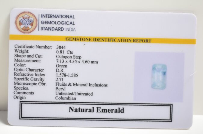 Beautiful 0.81 Cts Natural Emerald (AAA+-Mines) sva 0+ Ratti EMERALD. Free Horoscope & Free Pundit Ji Astrological Advise / Consultation. Original Natural Lab certified gems by IGI GTL / Birth stones / Large Gem Selection of shree shubh Rashi Ratan Vedic dhan at Gem Mines. May Bhagwan Brahma, Vishnu, Shiv & Universe bless you.