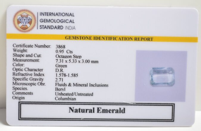 Beautiful 0.95 Cts Natural Emerald (AAA+-Mines) sva 1+ Ratti EMERALD. Free Horoscope & Free Pundit Ji Astrological Advise / Consultation. Original Natural Lab certified gems by IGI GTL / Birth stones / Large Gem Selection of shree shubh Rashi Ratan Vedic dhan at Gem Mines. May Bhagwan Brahma, Vishnu, Shiv & Universe bless you.