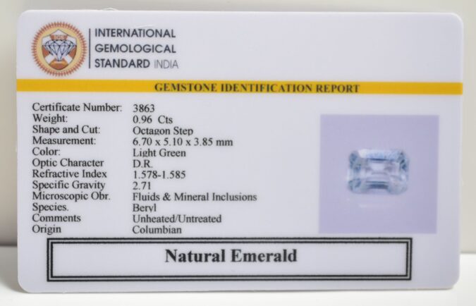 Beautiful 0.96 Cts Natural Emerald (AAA+-Mines) sva 1+ Ratti EMERALD. Free Horoscope & Free Pundit Ji Astrological Advise / Consultation. Original Natural Lab certified gems by IGI GTL / Birth stones / Large Gem Selection of shree shubh Rashi Ratan Vedic dhan at Gem Mines. May Bhagwan Brahma, Vishnu, Shiv & Universe bless you.