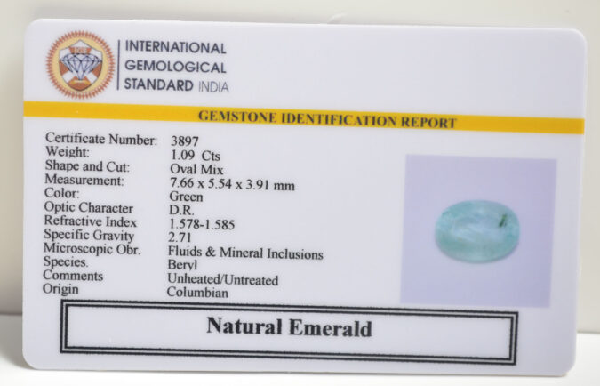 Beautiful 1.09 Cts Natural Emerald (AAA+-Mines) sva 1+ Ratti EMERALD. Free Horoscope & Free Pundit Ji Astrological Advise / Consultation. Original Natural Lab certified gems by IGI GTL / Birth stones / Large Gem Selection of shree shubh Rashi Ratan Vedic dhan at Gem Mines. May Bhagwan Brahma, Vishnu, Shiv & Universe bless you.