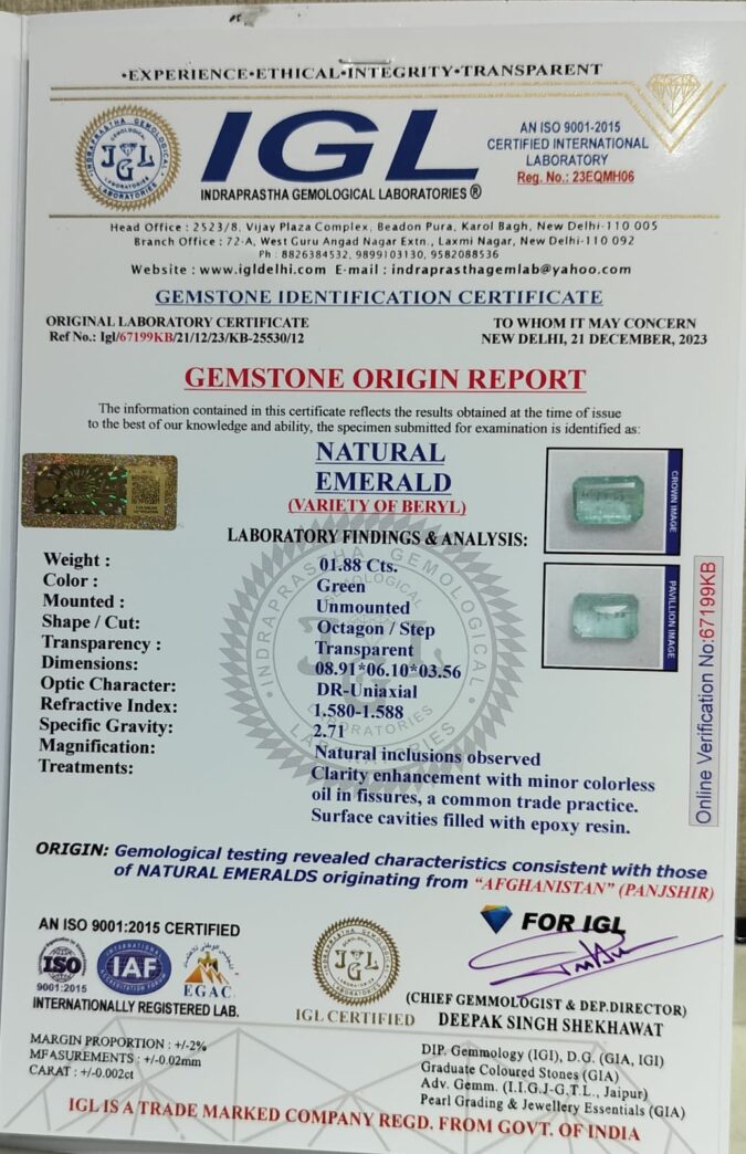 Beautiful 1.88 Ct. Natural Emerald (Top+-Mines) sva 2+ Ratti Panna. Free Horoscope & Free Pundit Ji Astrological Advise / Consultation. Original Natural Lab certified gems by IGI GTL / Birth stones / Large Gem Selection of shree shubh Rashi Ratan Vedic dhan at Gem Mines. May Bhagwan Brahma, Vishnu, Shiv & Universe bless you.