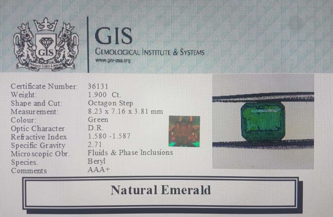 Beautiful 1.9 Ct. Emerald (Emerald Mines) Sava 2 Ratti Panna. Free Horoscope & Free Pundit Ji Advise / Consultation. Original Natural Lab certified gems by IGI GTL / Birth stones / Large Gem Selection of shree shubh Rashi Ratan Vedic dhan at Gem Mines. May Bhagwan Brahma, Vishnu, Shiv & Universe bless you.