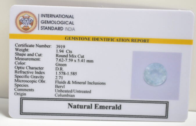 Beautiful 1.94 Cts Natural Emerald (AAA+-Mines) sva 2+ Ratti EMERALD. Free Horoscope & Free Pundit Ji Astrological Advise / Consultation. Original Natural Lab certified gems by IGI GTL / Birth stones / Large Gem Selection of shree shubh Rashi Ratan Vedic dhan at Gem Mines. May Bhagwan Brahma, Vishnu, Shiv & Universe bless you.