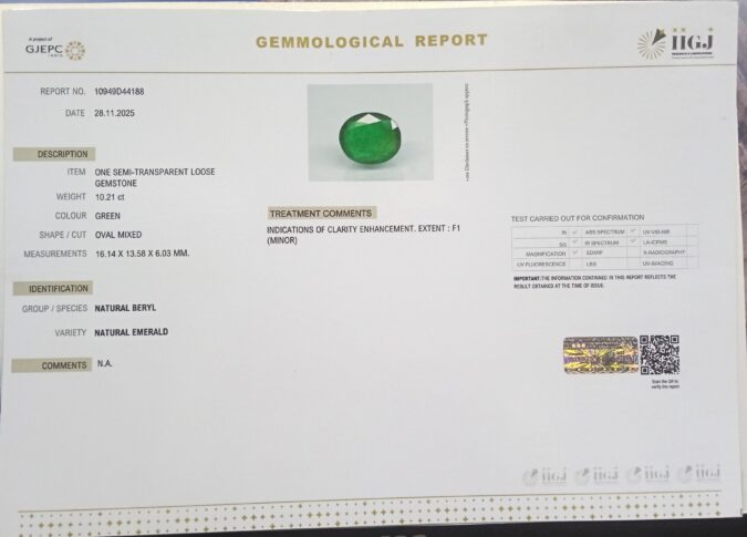 Beautiful 10.21 Cts Natural Emerald (Top++-Mines) sva 11+ Ratti EMERALD. Free Horoscope & Free Pundit Ji Astrological Advise / Consultation. Original Natural Lab certified gems by IGI GTL / Birth stones / Large Gem Selection of shree shubh Rashi Ratan Vedic dhan at Gem Mines. May Bhagwan Brahma, Vishnu, Shiv & Universe bless you.