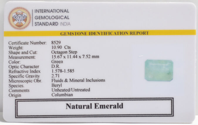 Beautiful 10.9 Cts Natural Emerald (AAA-Mines) sva 12+ Ratti EMERALD. Free Horoscope & Free Pundit Ji Astrological Advise / Consultation. Original Natural Lab certified gems by IGI GTL / Birth stones / Large Gem Selection of shree shubh Rashi Ratan Vedic dhan at Gem Mines. May Bhagwan Brahma, Vishnu, Shiv & Universe bless you.