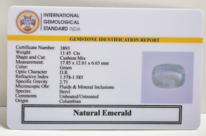 Beautiful 11.45 Cts Natural Emerald (Very Good-Mines) sva 12+ Ratti EMERALD. Free Horoscope & Free Pundit Ji Astrological Advise / Consultation. Original Natural Lab certified gems by IGI GTL / Birth stones / Large Gem Selection of shree shubh Rashi Ratan Vedic dhan at Gem Mines. May Bhagwan Brahma, Vishnu, Shiv & Universe bless you.
