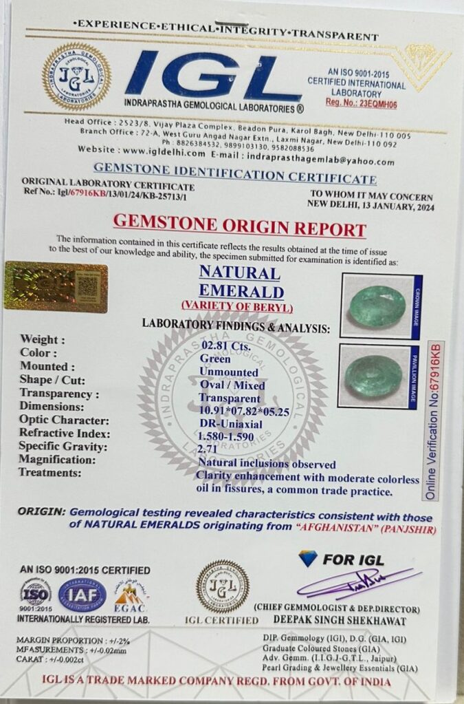 Beautiful 2.81 Cts Natural Emerald (Top-Mines) sva 3+ Ratti EMERALD. Free Horoscope & Free Pundit Ji Astrological Advise / Consultation. Original Natural Lab certified gems by IGI GTL / Birth stones / Large Gem Selection of shree shubh Rashi Ratan Vedic dhan at Gem Mines. May Bhagwan Brahma, Vishnu, Shiv & Universe bless you.