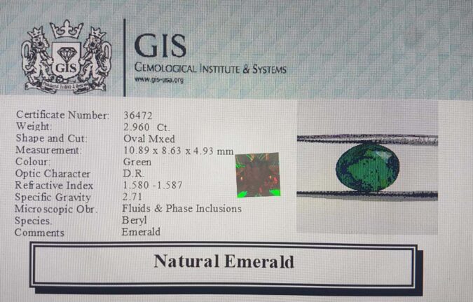 Beautiful 2.96 Ct. Emerald (Emerald Mines) Sava 3 Ratti Panna. Free Horoscope & Free Pundit Ji Advise / Consultation. Original Natural Lab certified gems by IGI GTL / Birth stones / Large Gem Selection of shree shubh Rashi Ratan Vedic dhan at Gem Mines. May Bhagwan Brahma, Vishnu, Shiv & Universe bless you.