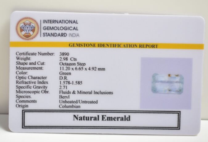 Beautiful 2.98 Cts Natural Emerald (AAA+-Mines) sva 3+ Ratti EMERALD. Free Horoscope & Free Pundit Ji Astrological Advise / Consultation. Original Natural Lab certified gems by IGI GTL / Birth stones / Large Gem Selection of shree shubh Rashi Ratan Vedic dhan at Gem Mines. May Bhagwan Brahma, Vishnu, Shiv & Universe bless you.