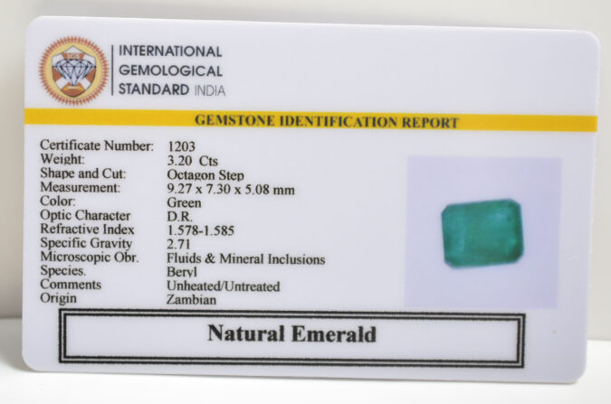 Beautiful 3.2 Cts Natural Emerald (AAA+Mines) sva 3 Ratti EMERALD. Free Horoscope & Free Pundit Ji Astrological Advise / Consultation. Original Natural Lab certified gems by IGI GTL / Birth stones / Large Gem Selection of shree shubh Rashi Ratan Vedic dhan at Gem Mines. May Bhagwan Brahma, Vishnu, Shiv & Universe bless you.