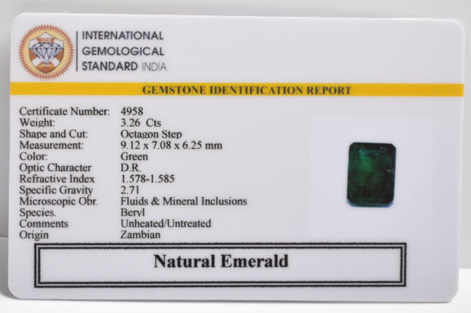 Beautiful 3.26 Cts Natural Emerald (Top-Mines) sva 3+ Ratti EMERALD. Free Horoscope & Free Pundit Ji Astrological Advise / Consultation. Original Natural Lab certified gems by IGI GTL / Birth stones / Large Gem Selection of shree shubh Rashi Ratan Vedic dhan at Gem Mines. May Bhagwan Brahma, Vishnu, Shiv & Universe bless you.