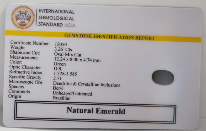 Beautiful 3.26 Cts Natural Emerald (Very Good-Mines) sva 3+ Ratti EMERALD. Free Horoscope & Free Pundit Ji Astrological Advise / Consultation. Original Natural Lab certified gems by IGI GTL / Birth stones / Large Gem Selection of shree shubh Rashi Ratan Vedic dhan at Gem Mines. May Bhagwan Brahma, Vishnu, Shiv & Universe bless you.