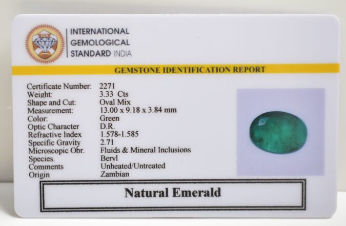 Beautiful 3.33 Cts Natural Emerald (AAA+-Mines) sva 3+ Ratti EMERALD. Free Horoscope & Free Pundit Ji Astrological Advise / Consultation. Original Natural Lab certified gems by IGI GTL / Birth stones / Large Gem Selection of shree shubh Rashi Ratan Vedic dhan at Gem Mines. May Bhagwan Brahma, Vishnu, Shiv & Universe bless you.