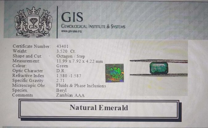 Beautiful 3.52 Ct. Emerald (Zambian Mines) Sava 3 Ratti Panna. Free Horoscope & Free Pundit Ji Advise / Consultation. Original Natural Lab certified gems by IGI GTL / Birth stones / Large Gem Selection of shree shubh Rashi Ratan Vedic dhan at Gem Mines. May Bhagwan Brahma, Vishnu, Shiv & Universe bless you.