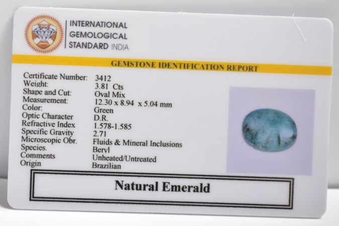 Beautiful 3.81 Cts Natural Emerald (Very Good-Mines) sva 4+ Ratti EMERALD. Free Horoscope & Free Pundit Ji Astrological Advise / Consultation. Original Natural Lab certified gems by IGI GTL / Birth stones / Large Gem Selection of shree shubh Rashi Ratan Vedic dhan at Gem Mines. May Bhagwan Brahma, Vishnu, Shiv & Universe bless you.