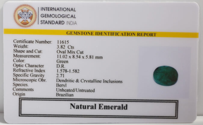 Beautiful 3.82 Cts Natural Emerald (Very Good-Mines) sva 4+ Ratti EMERALD. Free Horoscope & Free Pundit Ji Astrological Advise / Consultation. Original Natural Lab certified gems by IGI GTL / Birth stones / Large Gem Selection of shree shubh Rashi Ratan Vedic dhan at Gem Mines. May Bhagwan Brahma, Vishnu, Shiv & Universe bless you.