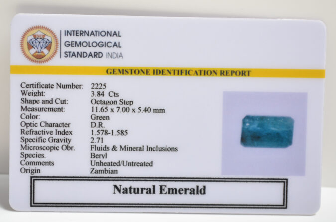 Beautiful 3.84 Cts Natural Emerald (Very Good-Mines) sva 4+ Ratti EMERALD. Free Horoscope & Free Pundit Ji Astrological Advise / Consultation. Original Natural Lab certified gems by IGI GTL / Birth stones / Large Gem Selection of shree shubh Rashi Ratan Vedic dhan at Gem Mines. May Bhagwan Brahma, Vishnu, Shiv & Universe bless you.