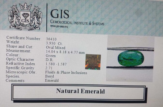 Beautiful 3.93 Ct. Emerald (Emerald Mines) Sava 4 Ratti Panna. Free Horoscope & Free Pundit Ji Advise / Consultation. Original Natural Lab certified gems by IGI GTL / Birth stones / Large Gem Selection of shree shubh Rashi Ratan Vedic dhan at Gem Mines. May Bhagwan Brahma, Vishnu, Shiv & Universe bless you.